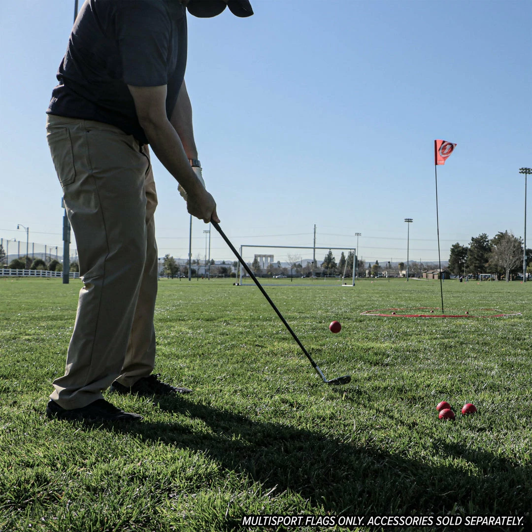 - SPORTS GOLF FLAGS; The red sports flags with white numbers are visible for game or practice use; 6 pack; Great for parents helping kids train at home or coaches running drills at practice; Built in stake helps keep flags sturdy and stable