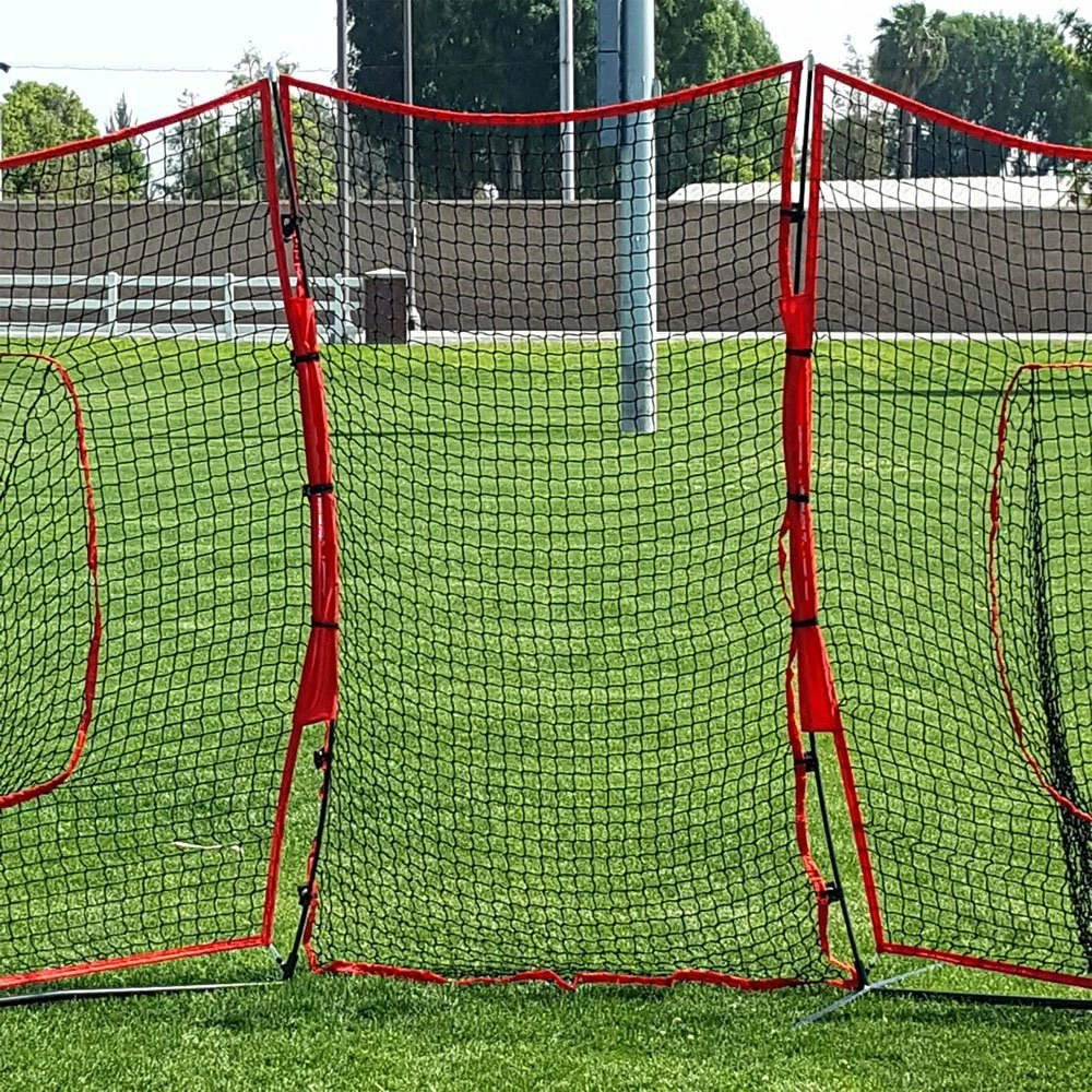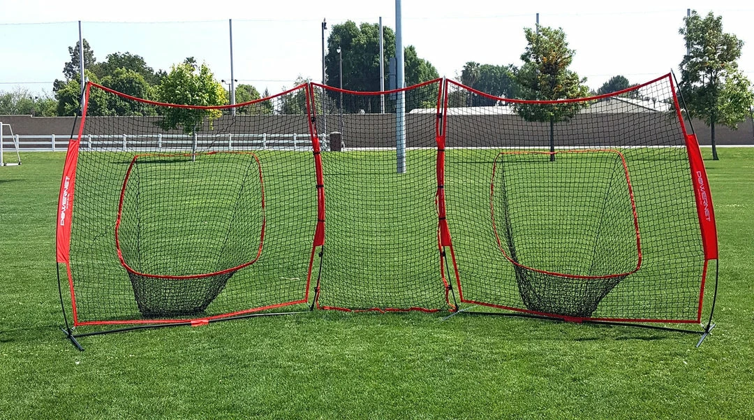 PowerNet’s Backstop Bundle includes everything you need for dual hitting stations. This dual 7×7 net with 4×7 connector offer 378 sq ft off protection for players or spectators. This setup can be used as an instant backstop for scrimmages or internal team play. This bundle has a multi-configuration including: Inline, Staggered and Angled setup. Place this backstop anywhere you need protection from errant throws, mis-hits or foul tips. These nets are durable and ultra-portable, perfect for any tee-ball, baseball or softball practice. This system is great for any in-field practice, soft-toss, batting, pitching or catching practice. These nets are designed with Flex Poles which are designed to allow a slight bend in the poles to allow flex and can withstand any level of play from tee-ball to professional level play.
