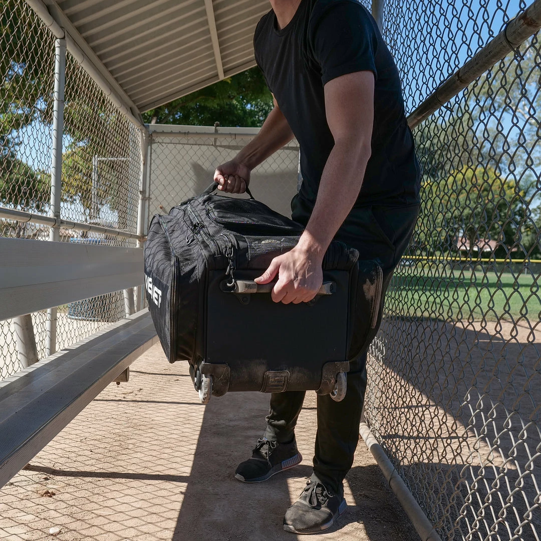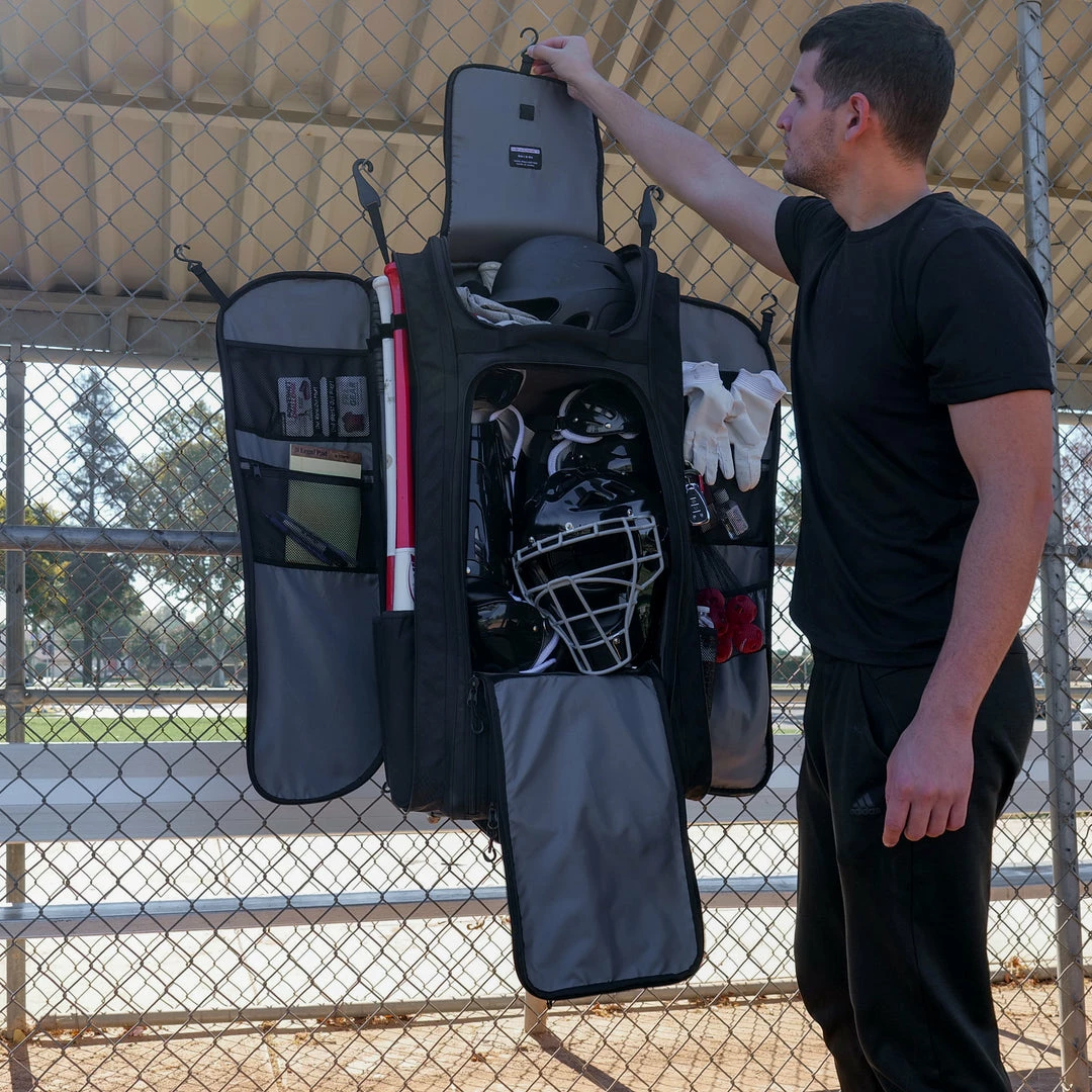 The PowerNet Optimus Catcher’s Bag hauls a large amount of gear for practice or gameday.