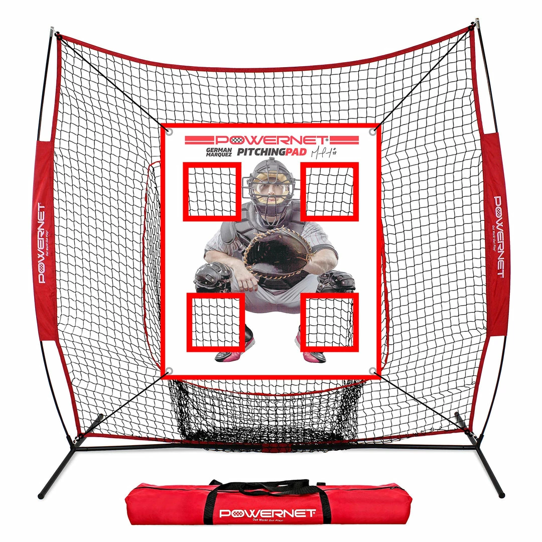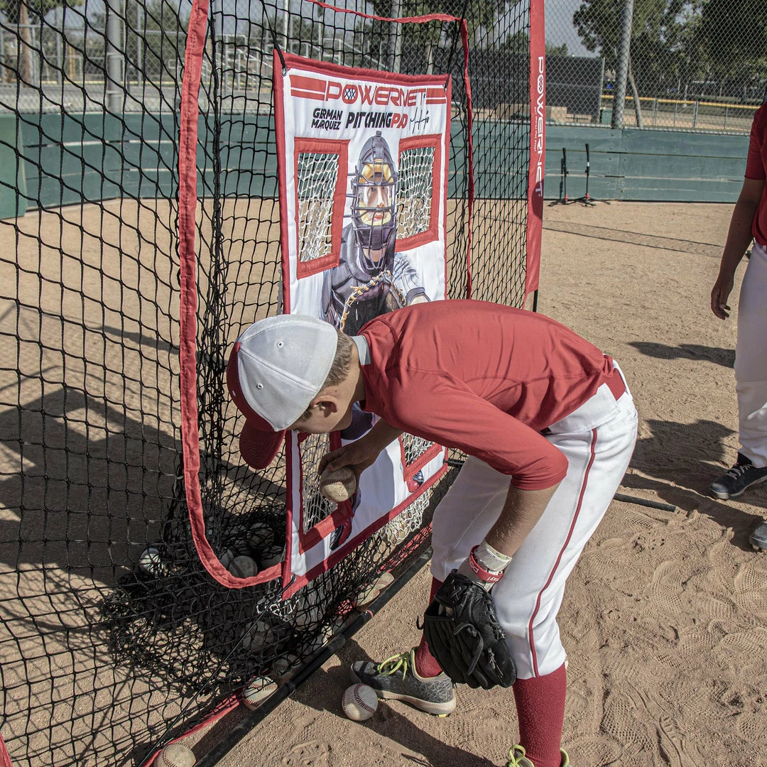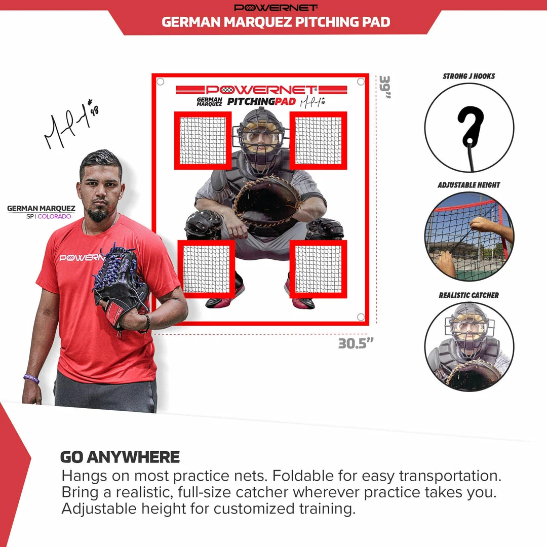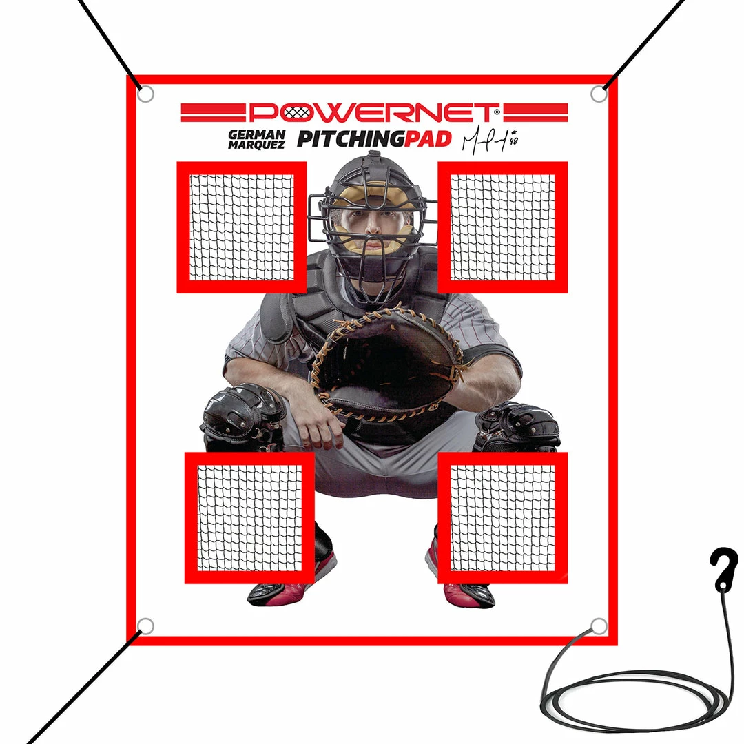 The PowerNet German Marquez Pitching Pad is great for all ages. This training tool helps pitchers track their pitch with the netted pockets that catch any ball thrown through each quadrant. The 4 quadrants with a catcher allows players to visualize the strike zone and provides immediate feedback. Perfect tool for solo training anywhere.