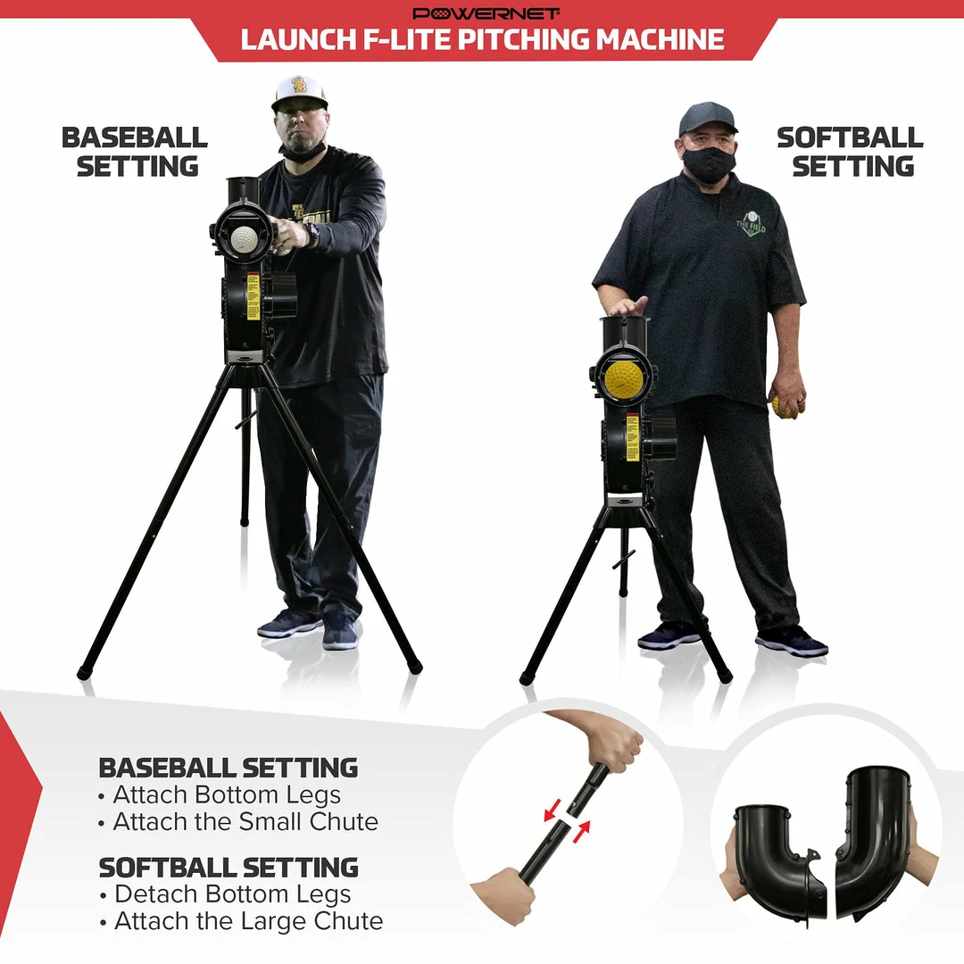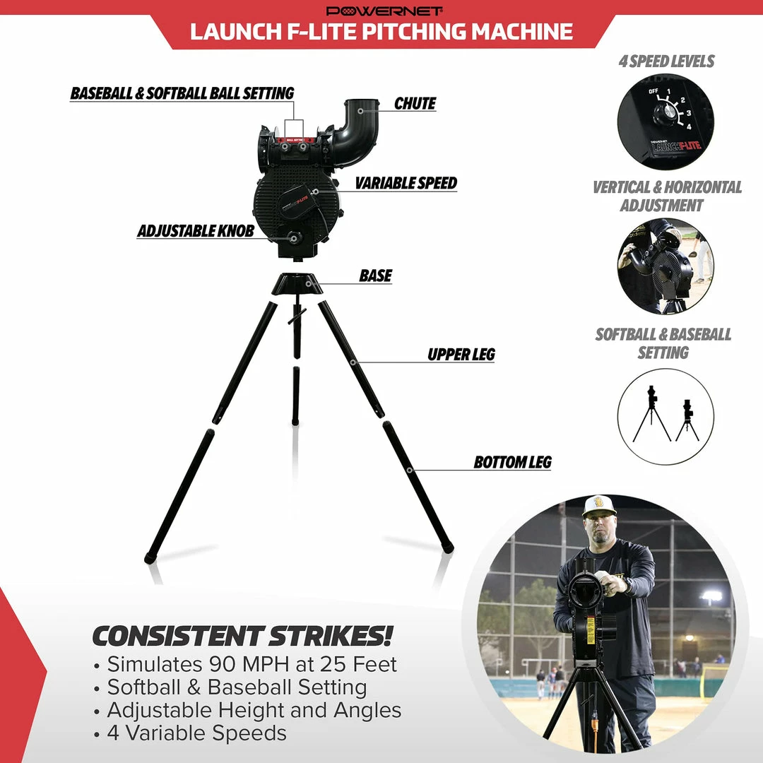 The PowerNet Launch F-lite Pitching Machine can pitch at four different speeds up to 90 MPH at a 25 foot distance. Adjustable legs make baseball to softball conversion quick and easy in order to simulate a realistic delivery height.