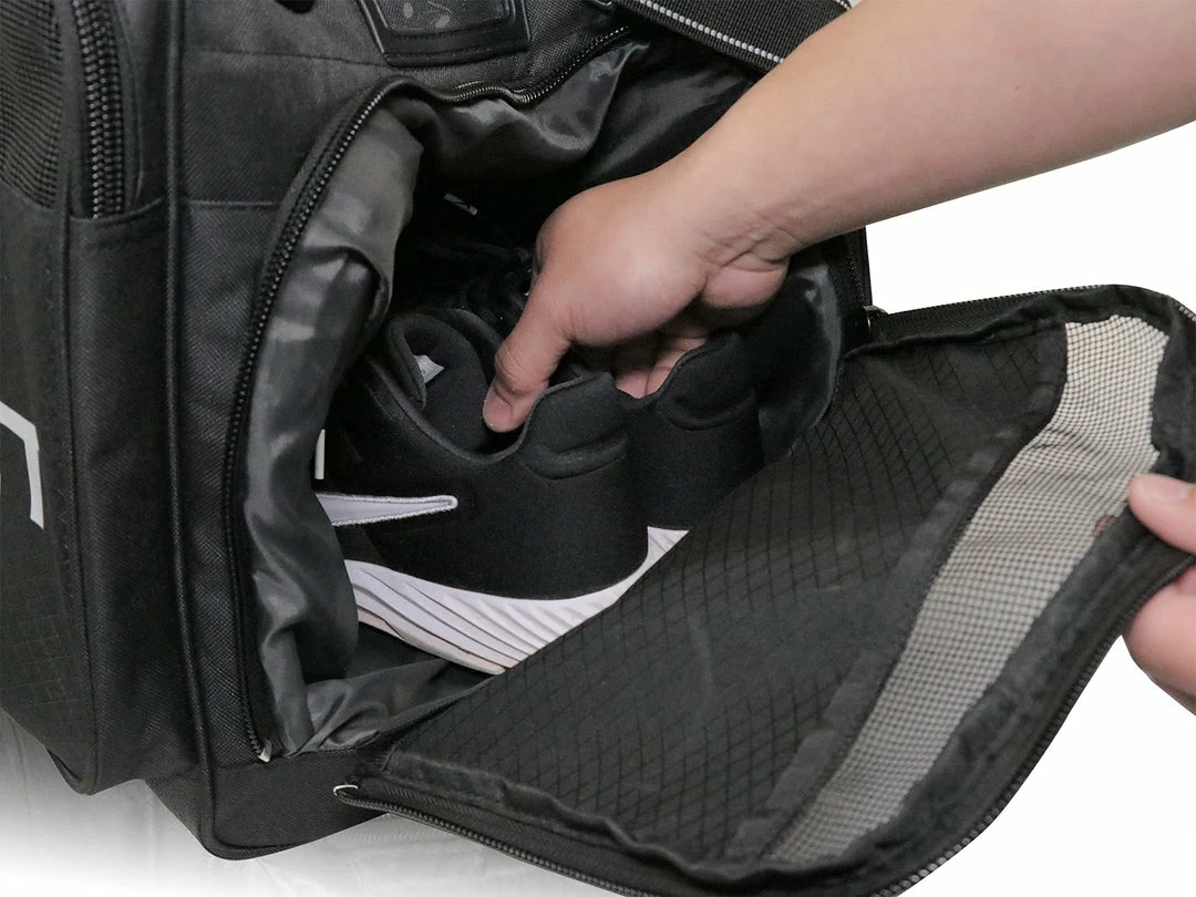 - VENTILATED SHOE COMPARTMENT; Store your athletic shoes separately from the rest of your gear while allowing them to air out to avoid trapping foul odor