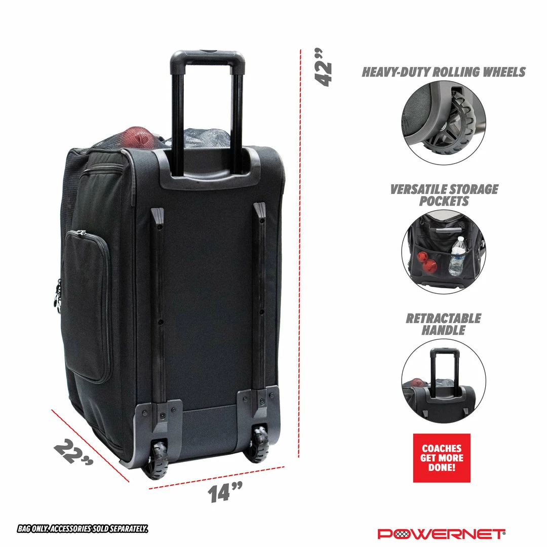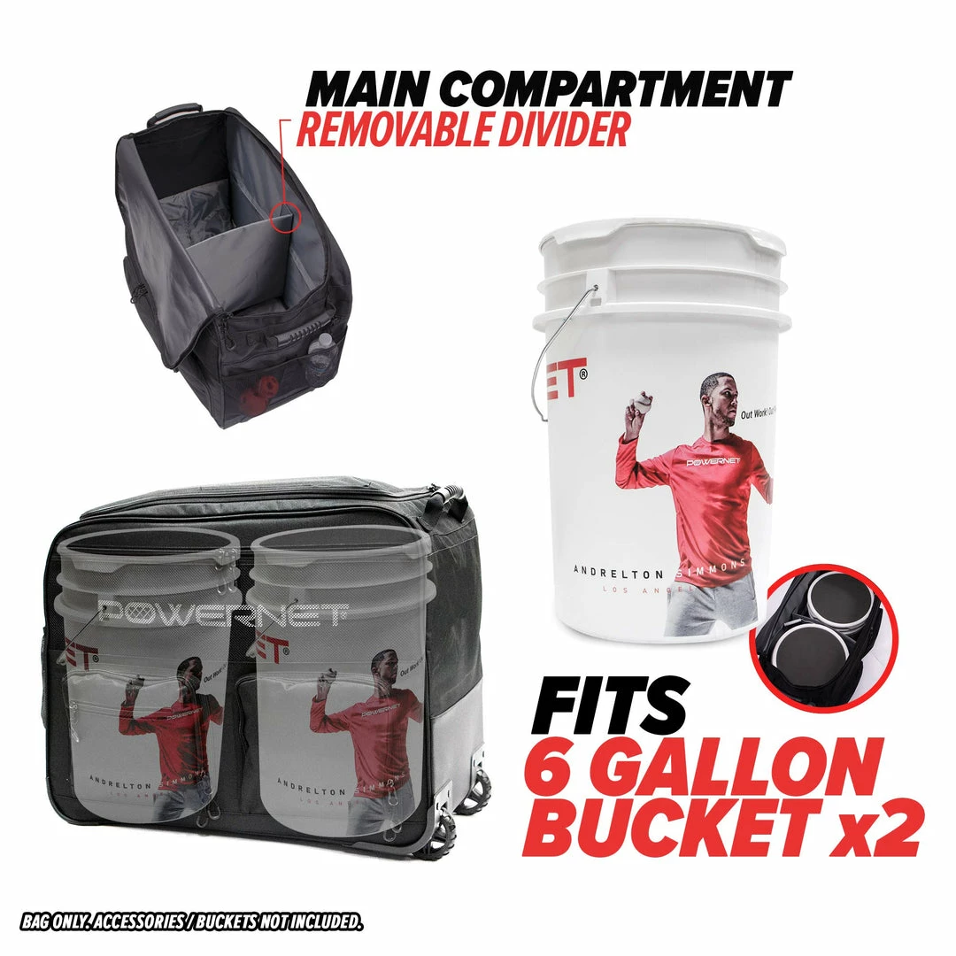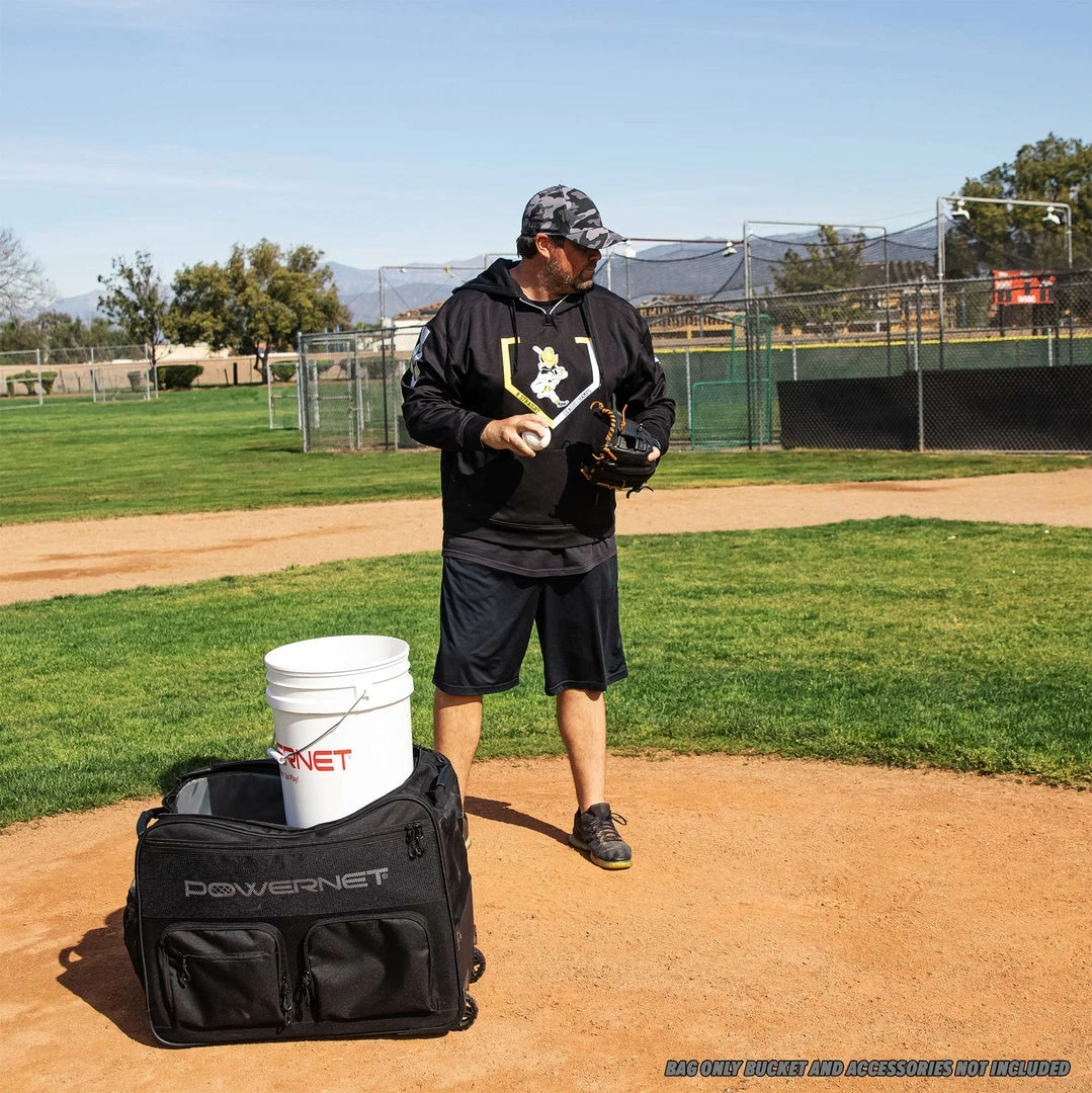PowerNets Coaching Dual Bucket Caddy makes practice easier and more effective. Carry all the baseballs or softballs youll need in one bag along with the rest of your coaching equipment. Wheel the cart right over the pitching mound and throw batting practice straight from the bag. Keep all of your gear organized and accessible from one spot thanks to the multiple zippered pockets and compartments. Telescoping handle and rugged wheels makes easy work of grass, dirt or asphalt.