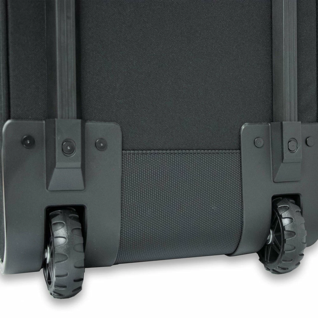 - DURABLE; Molded, durable plastic surrounds the wheels and bottom of the bag. Bag material is a heavy-duty fabric that is resistant to wear and tear. Two rails run along the bottom to stabilize the bag and minimize damage when set on the ground. Rails also provide protection when transferring the bag in and out of your vehicle or storage location