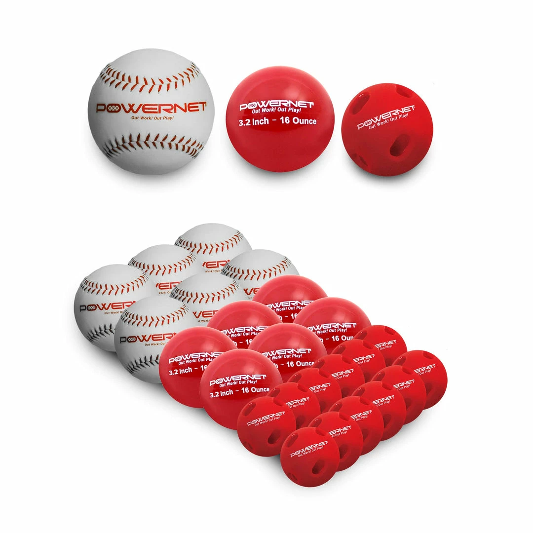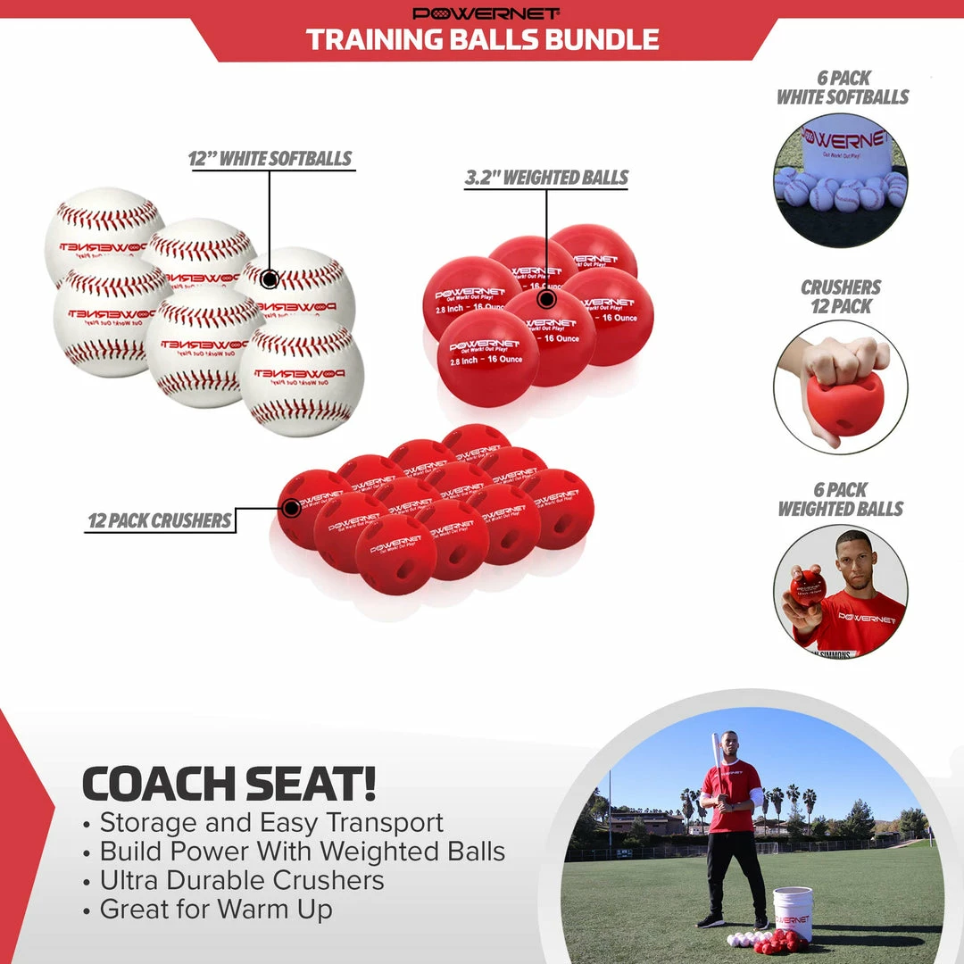 The PowerNet Softball Training Ball bundle includes 6 PowerNet Recreation Grade White 12 Inch Softballs, 6 3.2Inch 16oz Weighted Sand Filled Balls and 12 Limited Flight Crushers. This bundle is great to work at home or practice with a team. Coaches can run different batting and pitching drills with each type of training ball. The White color on the softballs provides a different tracking too for players.
