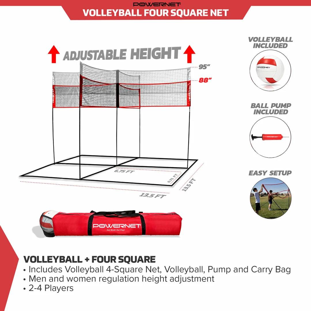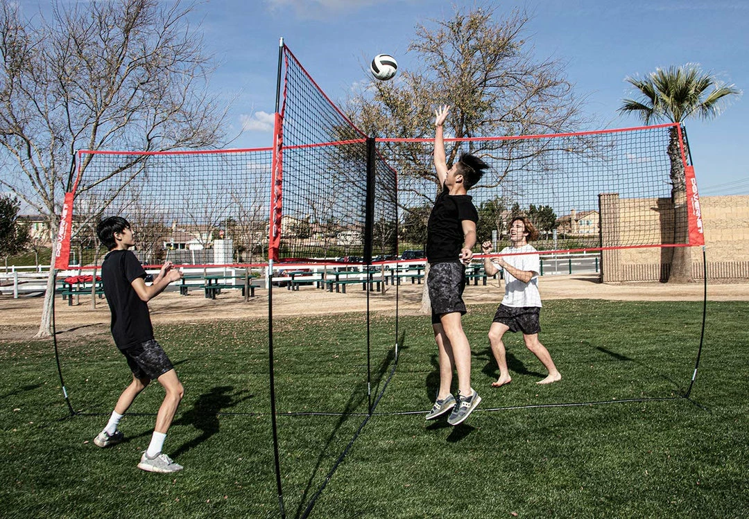 - FAST PACED FUN; We have combined volleyball and four square to create a great game that is non-stop fun while training; 4 players can be in their designated boundary at once; Coaches can have their team work on their set spike block and more simultaneously with this 4 sided net