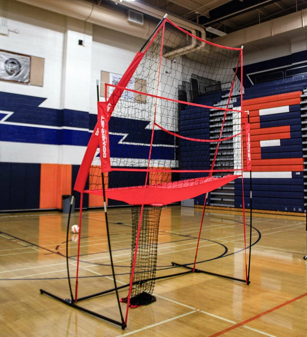 - 8′ HIGH by 11′ WIDE TRAINING STATION; Adjustable front net height for both men’s and women’s regulation height; PowerNet’s Volleyball training station is the perfect tool for any team or individual to work on their serving, hitting or passing. Perfect for team or solo practice and training drills; Bow style fiberglass vertical poles hold the net taut; Ball return makes easy work of gathering practice balls hit into training station